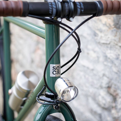 Déjà le 15è vélo conçu et réalisé sur mesure à l'atelier ! Aussi bien adapté à un usage quotidien en ville qu'aux voyages au long cours, j'ai conçu ce gravel pour Florent, artisan à Caen. Polyvalent, il est équipé de roues à la carte incluant une dynamo SON Nabendynamo et un moyeu Aivee CNC Components . Feux Busch + Müller KG, portes bagages Tubus, transmission Shimano GRX, pneus Hutchinson Cycling, selle Brooks England. Cadre sur mesure en acier Dedacciai Uno, fourche unicrown en acier Columbus 1919. Comme à chaque fois superbe peinture par Paul's Workshop.